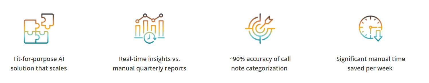 A biotech company struggled to achieve timely real-world insights from the vast amount of information contained in the unstructured call notes from field medical affairs reps stored in its CRM. The manual process of reading and categorizing the reports consumed considerable time and resulted in errors.