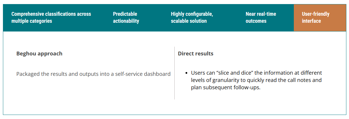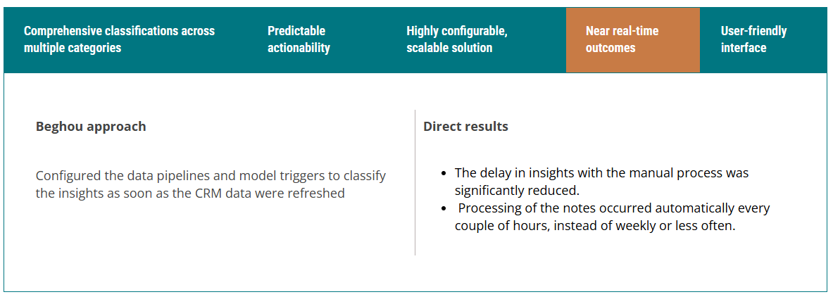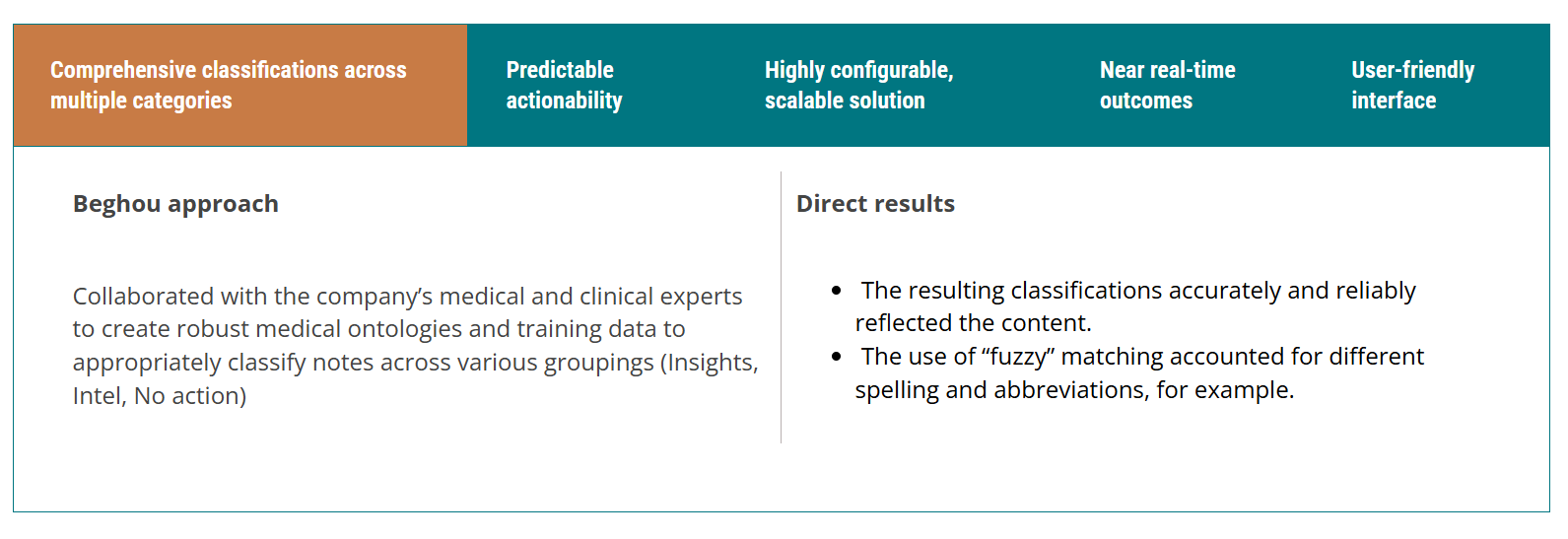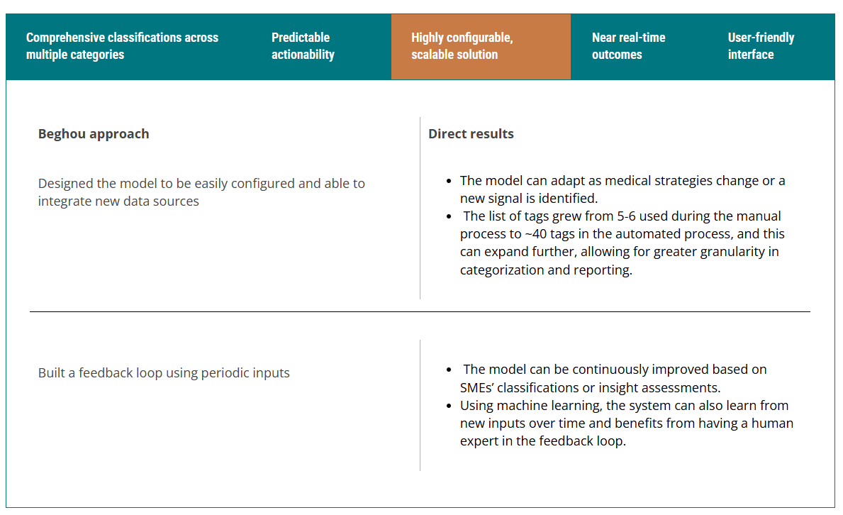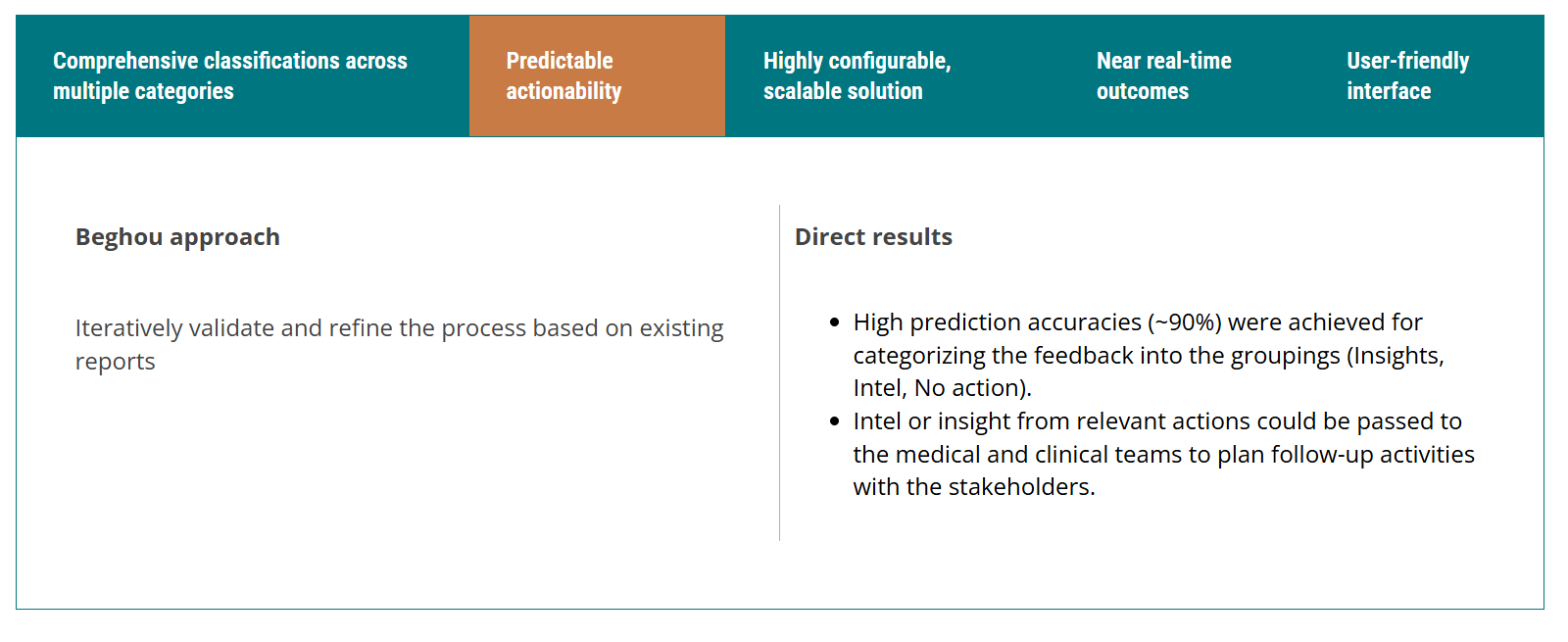 The team partnered with Beghou experts, including data scientists, medical analytics experts, and executive leadership (SMEs), to quickly implement a feasible NLP-driven AI solution to deliver the company’s vision of automated, reliable, timely insight tagging and more granular categorization and reporting. While this project was launched prior to the advent of GenAI, this technology could now be layered on to accelerate and enhance insight generation.